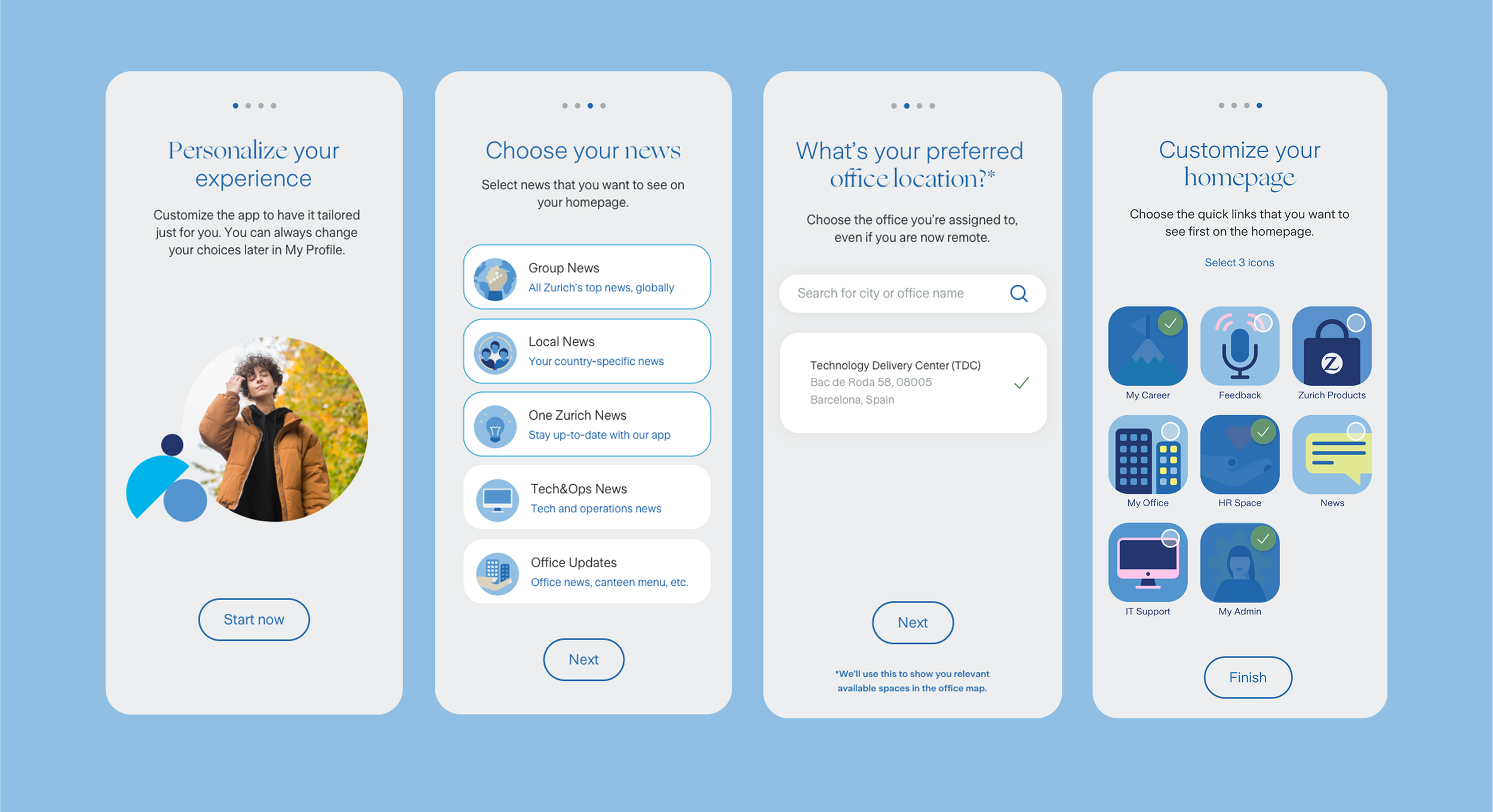 Sections that can be added and removed with ease + an onboarding that allows each employee to customize the app based on their needs. Boom.